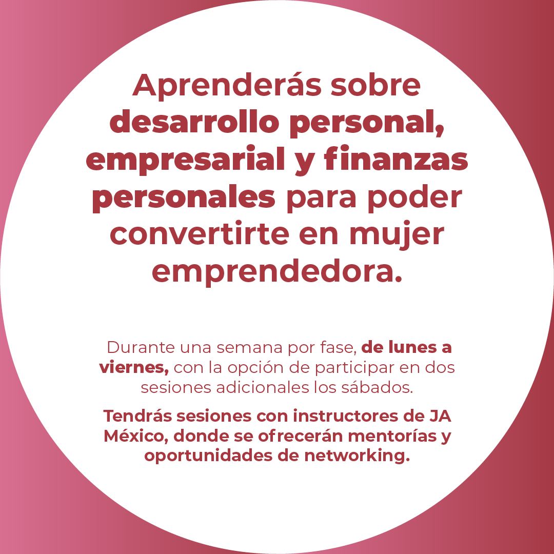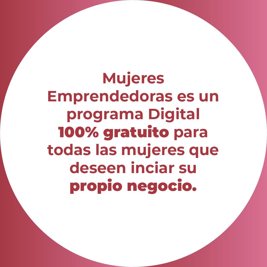 Es un programa digital 100% gratuito para mujeres de todas las edades, que te conecta con instructores expertos en emprendimiento y con otras mujeres interesadas en comenzar su negocio. Tendrás 3 fases de 1 semana de duración donde conocerás todo lo que necesitas para poner en marcha tu idea, Mujeres Emprendedoras busca ofrecer una experiencia educativa que permita a las participantes ampliar sus posibilidades para crear proactivamente mejores condiciones de bienestar a partir de tres resultados esperados: empoderamiento, emprendimiento y autonomía financiera.
